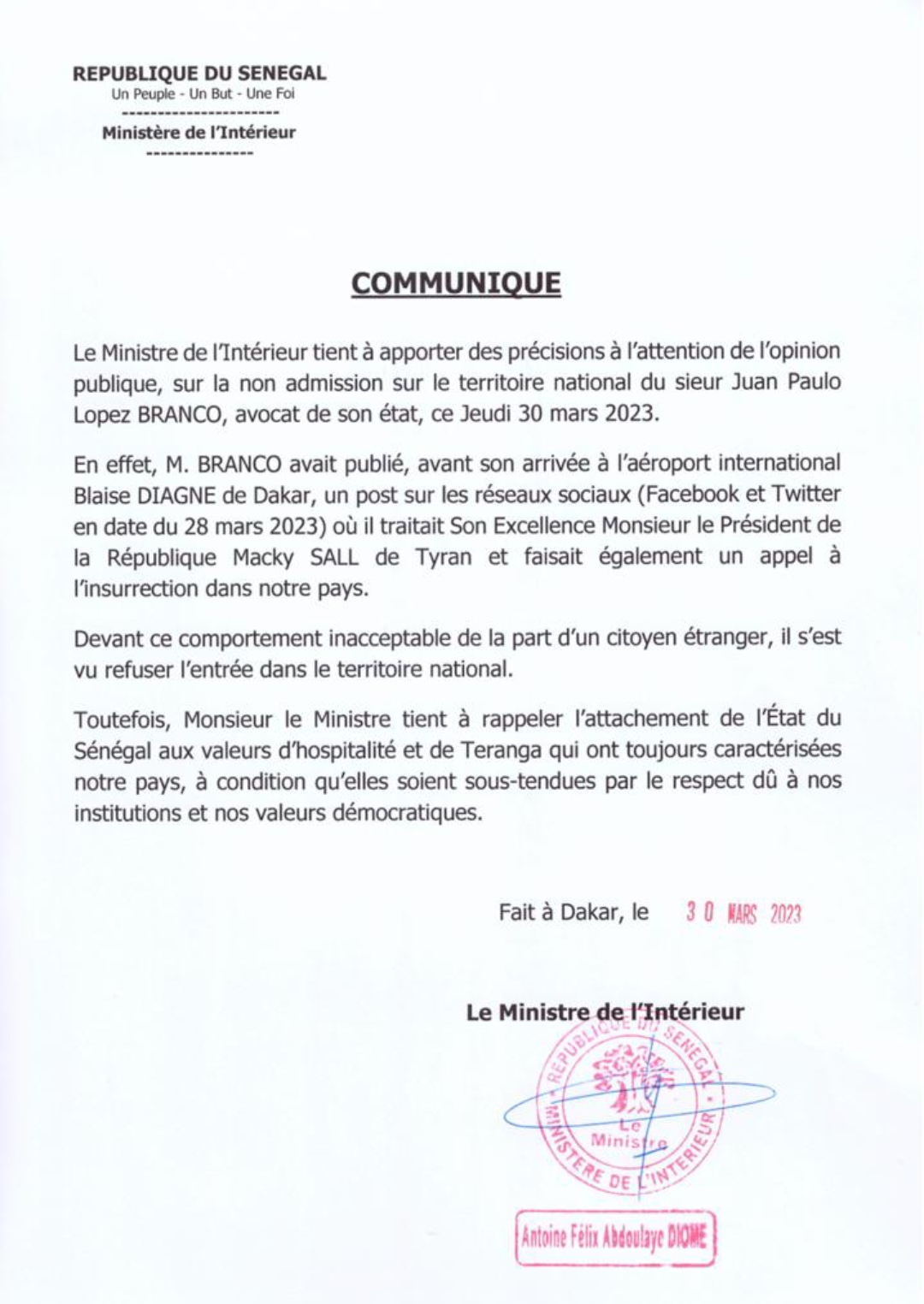 « En effet, M. Branco avait publié, avant son arrivée à l’aéroport international Blaise Diagne de Dakar, un post sur les réseaux sociaux (Facebook et Twitter, en date du 28 mars 2023) où il traitait Son Excellence Monsieur le Président de la République Macky Sall de tyran, et faisait également un appel à l’insurrection dans notre pays.
