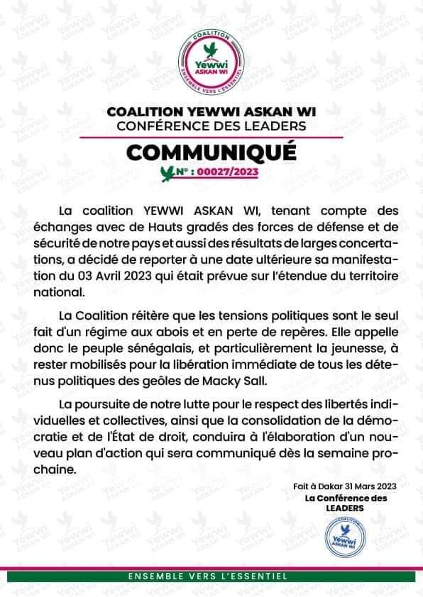 Yewwi renonce à la manifestation du 3 avril (document)